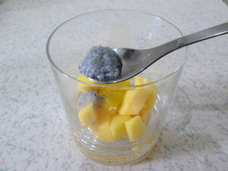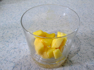 7、取一玻璃杯,加入芒果肉。