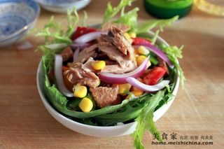 其实做沙拉的灵魂就是沙拉酱,我们平时最常用的可能就是超市里有售的丘比甜味、原味和千岛酱,或者其他品牌的沙拉酱。我也是直到前些天,在网上看到一些关于沙拉的话题后,才对这个普普通通的沙拉的看法大有改观,其实只需要用一些时令的蔬菜和水果,或者低脂的肉类,再花点儿小心思在上面,就能做出各种口味的沙拉,而“口味”主要取决于我们所调制的沙拉酱。 一款简单的金枪鱼沙拉,绝对称得上是小食材,大味道。各种食材的组合,使这道沙拉的营养更加均衡,补充人体所必需的维生素,氨基酸等等的同时,又能降低胆固醇含量,享受美味的同时就把肥肉给减了去,岂不是一件美事儿?配上苹果洋葱沙拉酱,好不好吃试试就知道了!