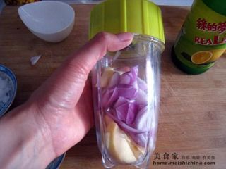 7.将这几种原料倒入搅碎的苹果、洋葱中搅均匀即成。