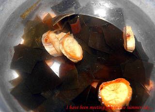 4、将螺片和海带放锅中,加水及姜片,煮开后转中火煮10分钟。