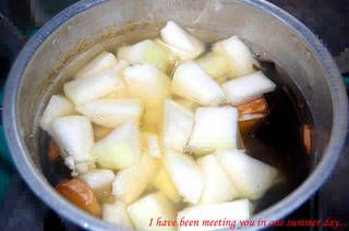 5、将冬瓜块放入,再次煮开后转中火,煮到冬瓜9分熟,落盐及白胡椒粉调味。