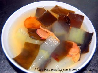 冬季减肥极为不易,因为天气原因,我们会很想进食。因此,要保持体形的同时兼顾饱腹,就要选择低脂低盐的饮食。远在温哥华的好友和先生共同经营着一家中医诊所,研究出十分有效的减肥疗法。但是,因为她的先生是一个执著的医生,认为治病救人才是医生的职责,所以减肥根本不算重要,哪怕再赚钱也不干。在我苦苦哀求下她才答应指导我的饮食,这道汤就是她告诉我的哟。她还特别强调,一定要放姜,并且一定要把姜吃下去。这道汤无油、低盐,冬瓜和海带都可以利水去浮肿,我还加了朋友送的螺片,热热的一碗喝下去,既鲜美又暖身。