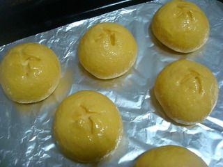 10.取出烤盘,将面包坯刷上蛋液。用剪刀剪出十字刀口。