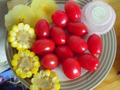 5.盘底铺上蔬菜,鳕鱼放在上面,用其他蔬菜装饰,番茄就放在上面好了。