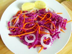 3.紫甘蓝胡萝卜切丝,用开水烫一下,水中有盐,白醋浸泡一分钟,洋葱切圈,芹菜焯水,放在烫紫甘蓝之前。