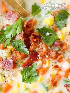 做法:将洋葱和培根切丝,稍微炒一炒,倒入水,放入南瓜肉煮一煮,令南瓜煮软为止。然后倒入牛奶和燕麦片,煮3分钟后,倒入盐、胡椒粉、清汤调味即可。