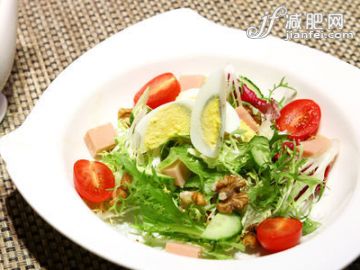 午餐:水煮鸡蛋2个,黄瓜1根,蔬菜沙拉1份,柠檬汁1杯。