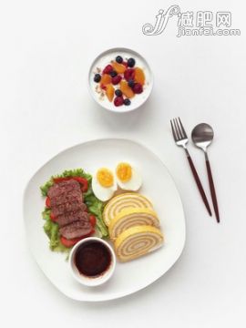 早餐:脱脂奶1杯、通心粉1碗、火腿1片