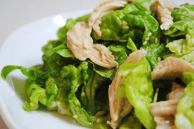 最后将2茶匙酱油、2茶匙醋、1茶匙糖和1/2茶匙盐混合在一起做成调味汁,拌在生菜鸡丝中。