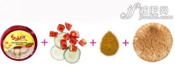 如何做:半杯鹰嘴豆泥,半勺咖喱粉,黄瓜切片和干西红柿用醋和盐以及胡椒调味。