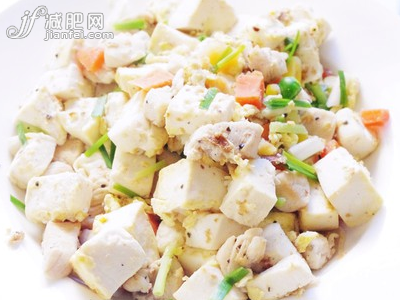 豆腐鸡胸肉切丁,裹上蛋液,葱姜蒜炝锅先后倒入鸡胸肉、豆腐进锅炒,然后出锅盛盘即可。