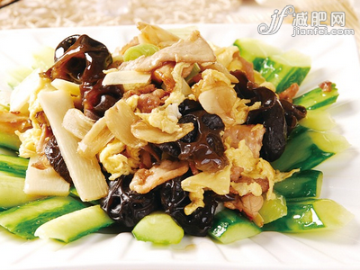 材料:猪里脊肉、黑木耳3朵、黄瓜1根、鸡蛋2个、干黄花菜10克、食盐3克、酱油15ML、料酒3ML、香油1ML、水淀粉、白砂糖3克、大葱8片、植物油。