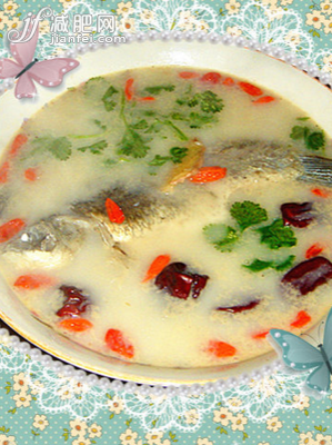 材料:鲫鱼1条。酱油、葱、姜、盐、胡椒面、味精各适量、枸杞子若干