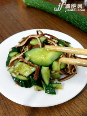 材料:黄瓜1根、豆腐1块、荷兰豆1碗、生抽、醋、香油、花椒粉