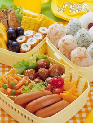 4.减肥便当:煮一些米饭(或者面条、意大利面等主食),盛4~6汤匙到饭盒里,作为第二天的午饭,拌上2~3汤匙切碎的蔬菜、沙拉和一些瘦肉及鱼肉(标准同1)。