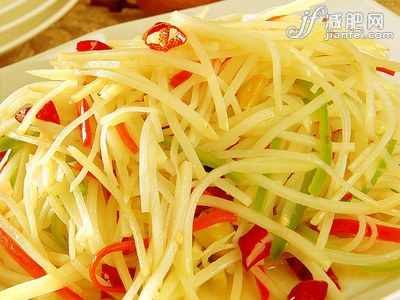 将胡萝卜、土豆洗净去皮切丝,用水浸泡片刻,将其捞出沥干水。将蒜末、葱白倒入锅中翻炒一会,尔后倒入土豆、胡萝卜、干辣椒一同翻炒,待其熟透后,倒入适量食醋、白糖、盐将其翻炒匀即可。这道菜能使产生饱腹感,减少进食量,还能有助于排出体内毒素,常食用能有助于减肥。