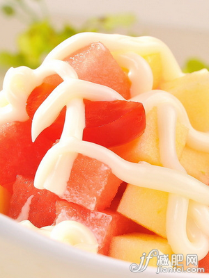 做法:哈密瓜、西瓜、苹果、菠萝、香蕉切丁入盘,把蜂蜜和蛋黄酱搅拌后倒入盘中。加入适量沙拉酱后和水果一起拌匀。樱桃放入加以点缀,最后加入草毒汁即可。